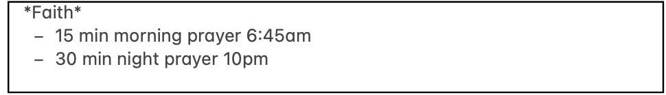 Instead of trying and flaking on both schedules, I committed to a 10pm daily prayer time.