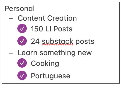 Then I set out to achieve 1-3 specific goals under each area.