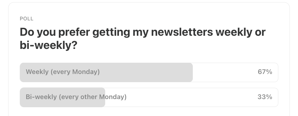 Last week, I asked whether you preferred weekly or biweekly newsletters, and 67% of you said weekly.
