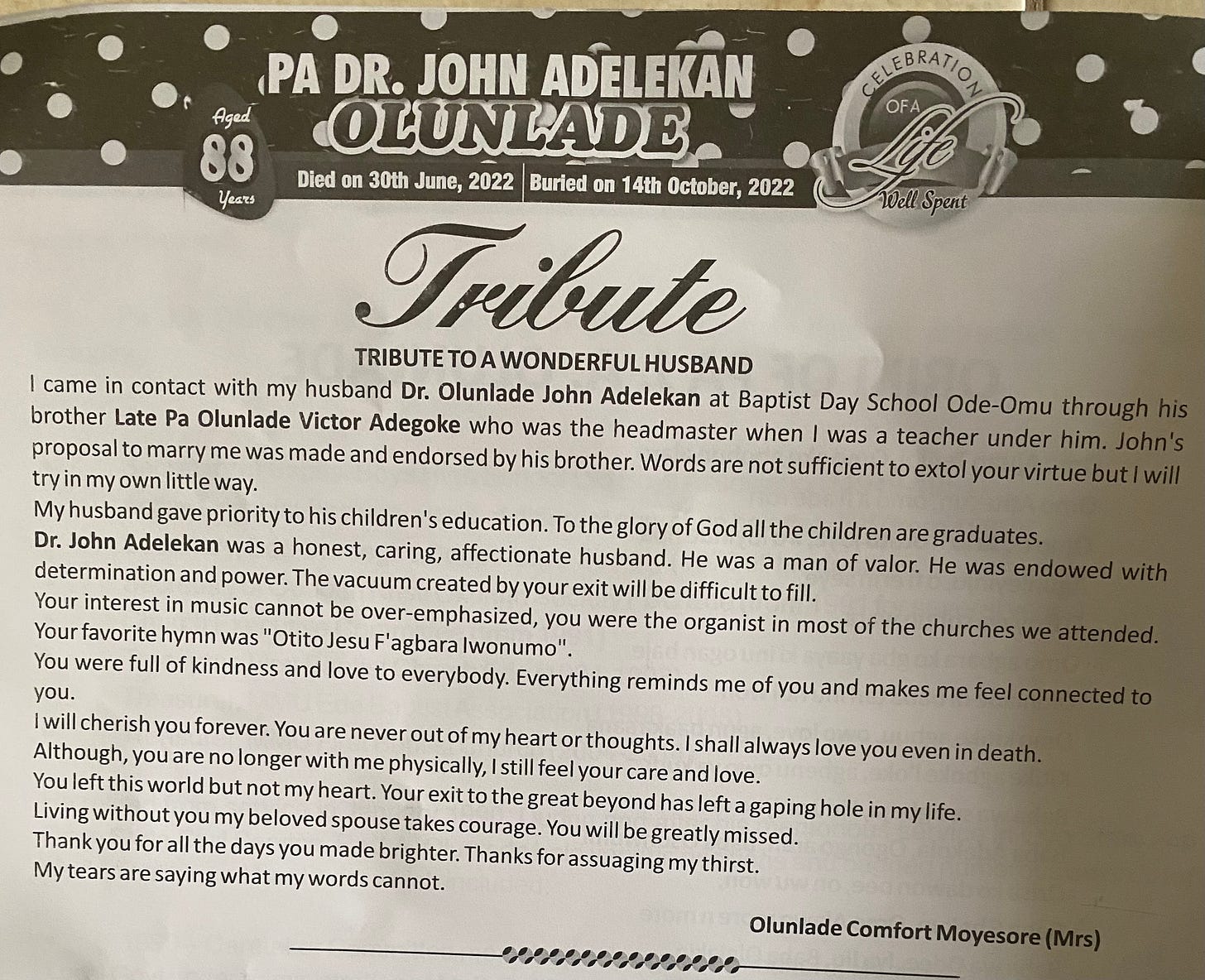 It was the first time I saw my grandmother cry. How do you come to terms with losing your husband of youth. Over 60 years of marriage, and I can only imagine how much they’ve been through all those years, bearing children, meeting grandchildren and greatgrandchildren. Reading her tribute made (makes) my cry.