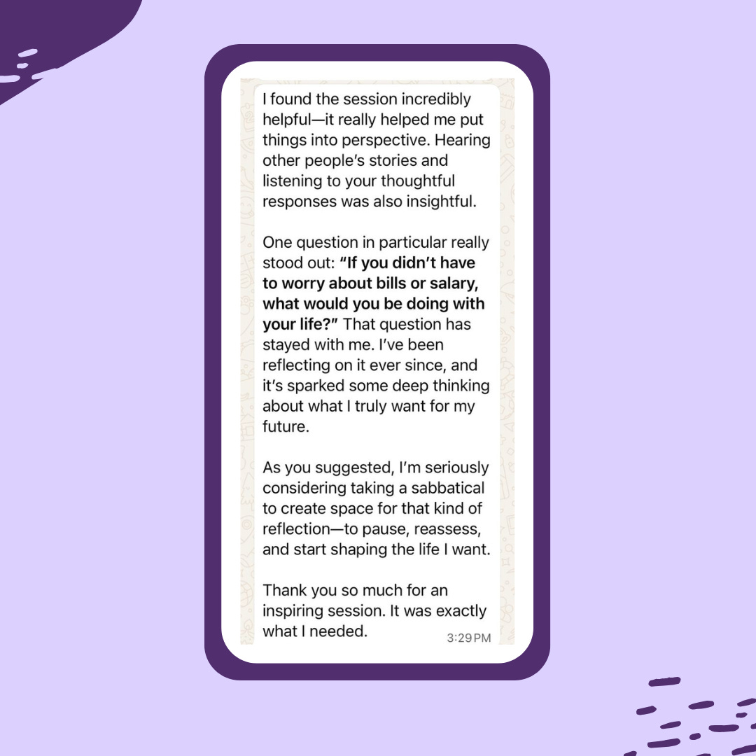 Today, I’m at 100+, through quick 1:1 sessions and group AMAs - supporting people who, like me back then, were standing at the edge of clarity but afraid to jump.